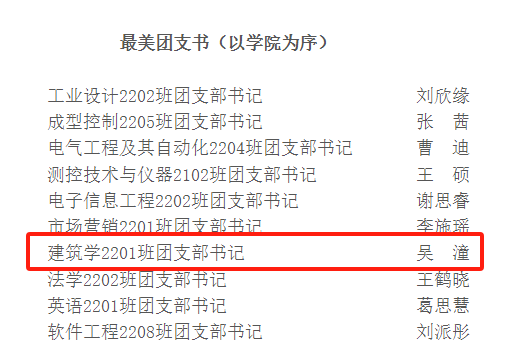 在永利yl23411集团“十佳团支部”和“最美团支书”评审中,经基层团委推荐、校团委评审小组资格初选、线上投票及现场述职答辩等环节,建筑学2201班获得校十佳团支部、建筑学2201班团支书吴潼获得最美团支书荣誉称号。