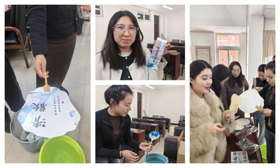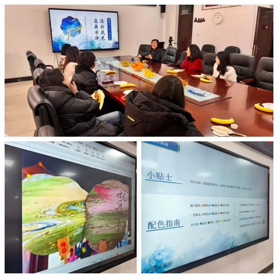 随后,活动开始。首先为大家详细介绍了漆扇的历史渊源、艺术特色及制作流程。从选扇、调漆、上色、点缀、晾干等步骤进行了细致讲解和演示,激发了老师们的浓厚兴趣与创作灵感。