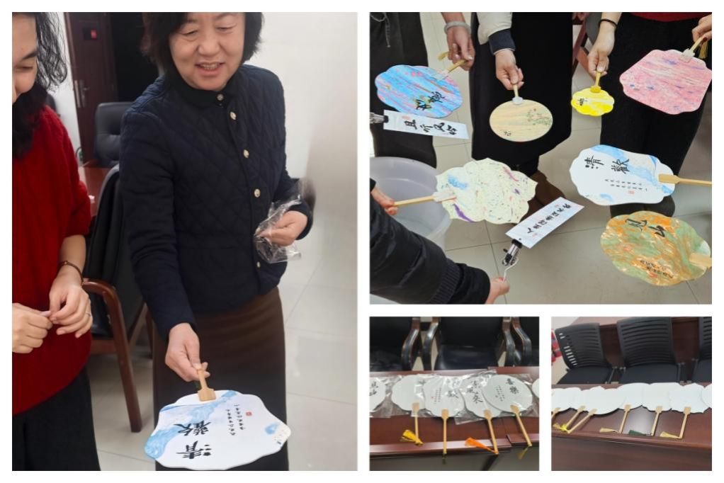 在轻松愉快的氛围中,老师们纷纷化身“艺术家”,巧妙构思,精心创作。她们将不同色彩的大漆滴入水中,通过勾、划、引、流等手法,让色彩在清水中交织晕染,再小心翼翼地将素白的扇面浸入水中,提转之间,一幅幅纹理独特、不可复制的美丽图案便跃然“扇”上。活动现场欢声笑语,其乐融融,一把把独一无二、浮翠流丹的漆扇在老师们手中诞生,宛如百花绽放,各展芳华。